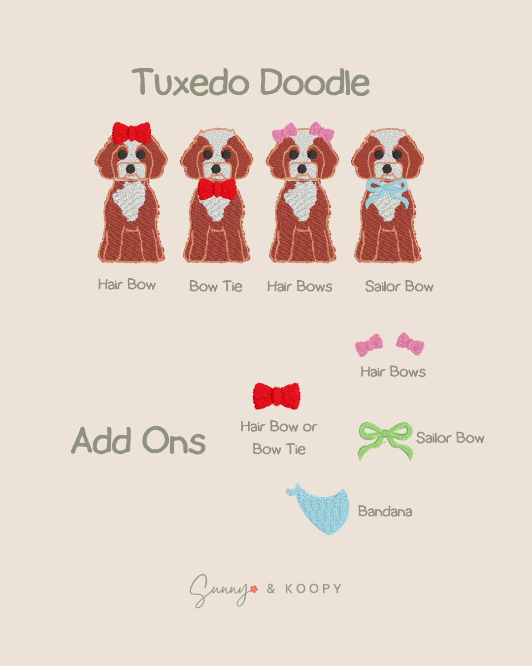 The doodle embroidery design itself cannot be fully customized and comes as shown in the design examples. However, you may leave the color of your doodle in the notes section and I will try to match your pup’s color as closely as possible for the solid doodle. Same for the partidoodle or tuxedo doodle, you will need to provide two colors.