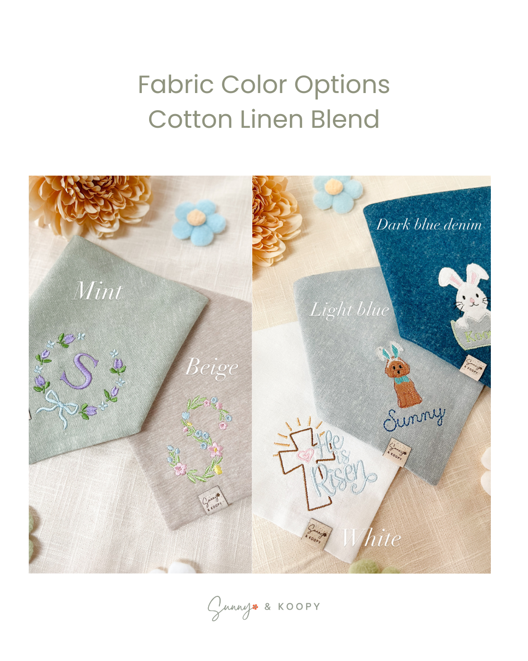 If you are interested in another fabric, please send me a message before ordering so I can confirm fabric availability and make sure the embroidery will look good on the selected fabric.